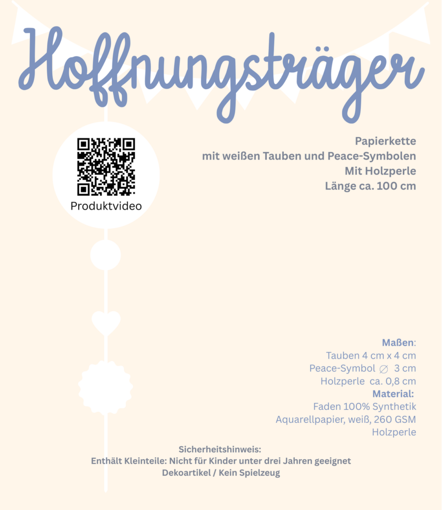 Vielleicht suchst du gerade nach einer besonderen Geschenkidee für eine Freundin, einen lieben Menschen oder für dich selbst? Diese Papiergirlande ist perfekt dafür. Sie bringt Hoffnung in jeden Raum und symbolisiert was wir uns alle wünschen: Frieden und Hoffnung.